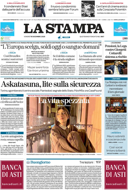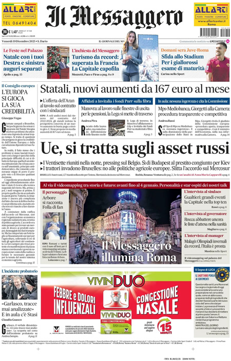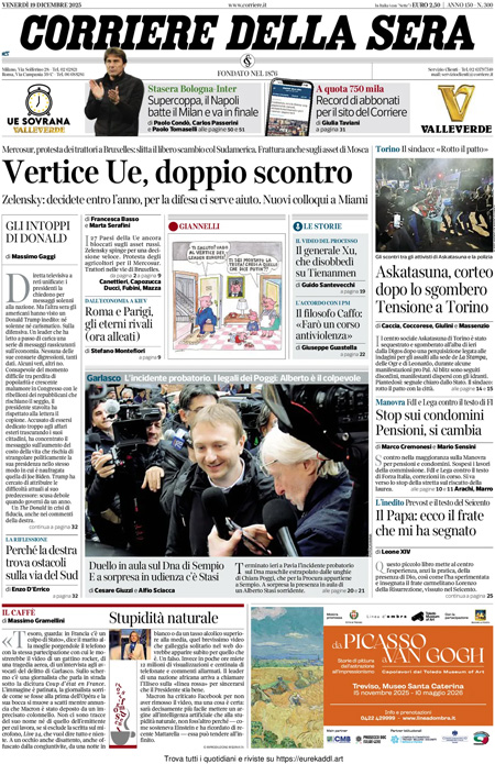 La notizia principale di oggi in apertura sui quotidiani è quella relativa alla riunione del Consiglio europeo, nel quale si è discusso del finanziamento degli aiuti all’Ucraina e deciso il rinvio della firma dell’accordo con il Mercosur. Spazio anche al confronto tra i partiti di maggioranza sull’emendamento alla legge di bilancio sul riscatto della laurea. “Vertice Ue, doppio scontro”, titola il Corriere. “Dietrofront sulle pensioni, caos nella maggioranza”, è l’apertura di Repubblica. “La Manovra fra le risse e il concerto di Baglioni”, è la prima pagina del Fatto Quotidiano.