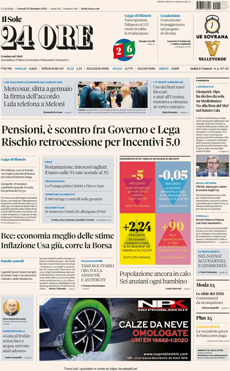 “Pensioni, è scontro fra Governo e Lega. Rischio retrocessione per Incentivi 5.0” (Il Sole 24 Ore).