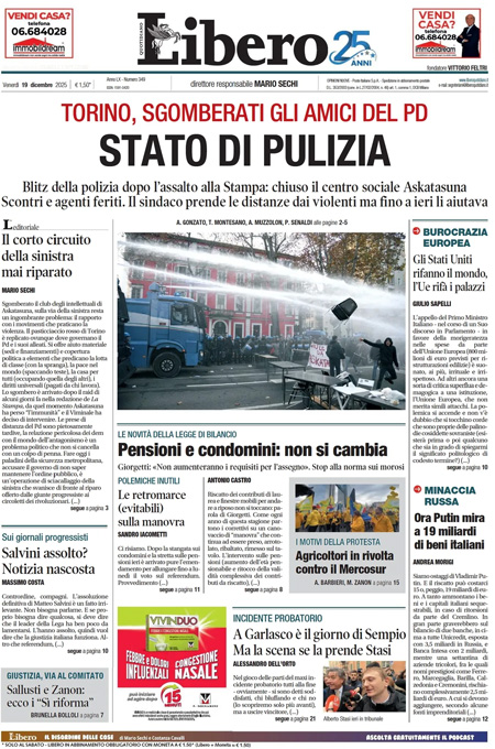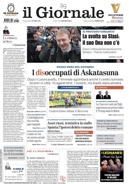“Il corto circuito della sinistra mai riparato”, di Mario Sechi: “Sgomberato il club degli intellettuali di Askatasuna, sulla via della sinistra resta un ingombrante problema: il rapporto con i movimenti che praticano la violenza. Il pasticciaccio rosso di Torino è replicato ovunque dove governano il Pd e i suoi alleati. Si offre aiuto materiale (sedi e finanziamenti) e copertura politica a elementi che predicano la lotta di classe (con la spranga), la pace nel mondo (spaccando teste), la casa per tutti (occupando quella degli altri), i diritti universali (pagati da chi lavora). Lo sgombero è arrivato dopo il raid di alcuni giorni fa nella redazione de La Stampa, da quel momento Askatasuna ha perso “l’immunità” e il Viminale ha deciso di intervenire”.