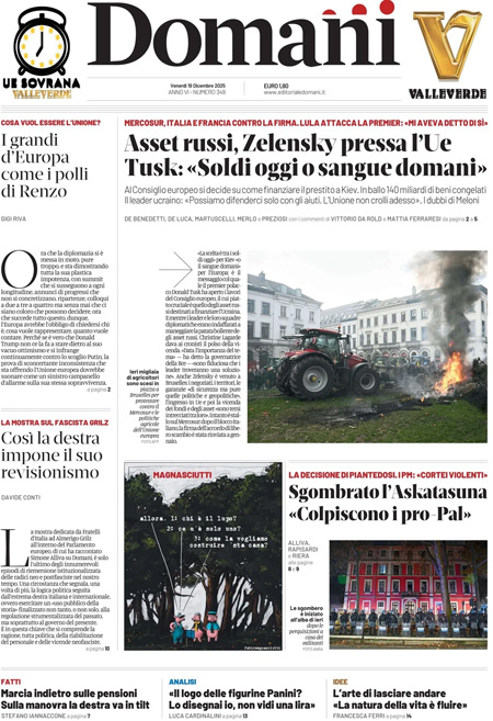 “Asset russi, Zelensky pressa l’Ue. Tusk: Soldi oggi o sangue domani” (Domani).
