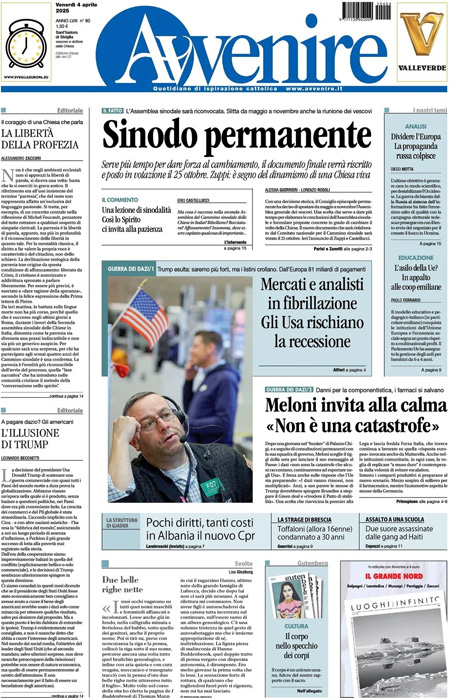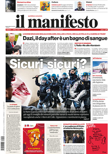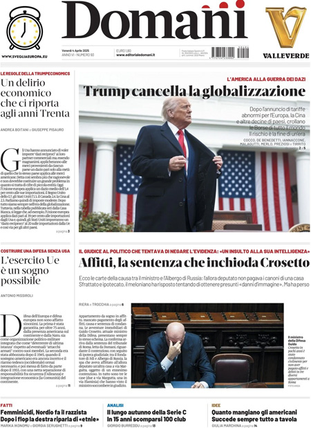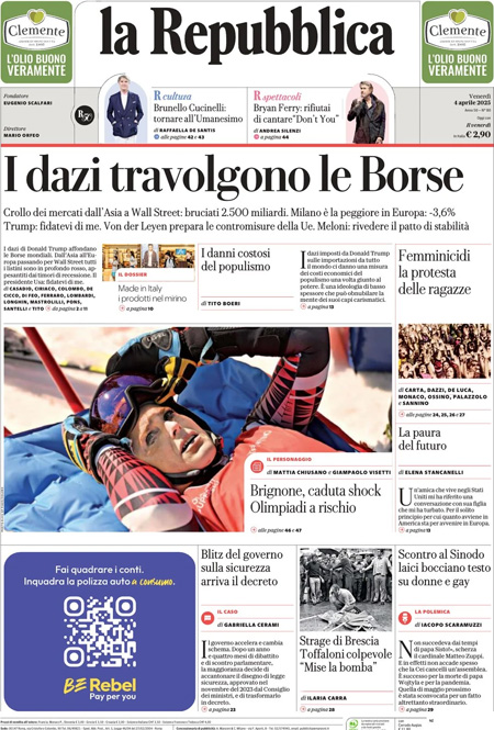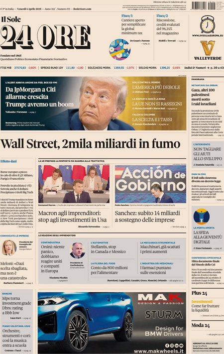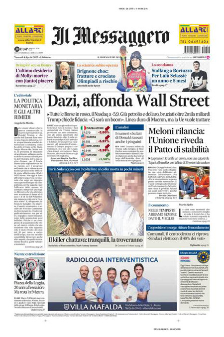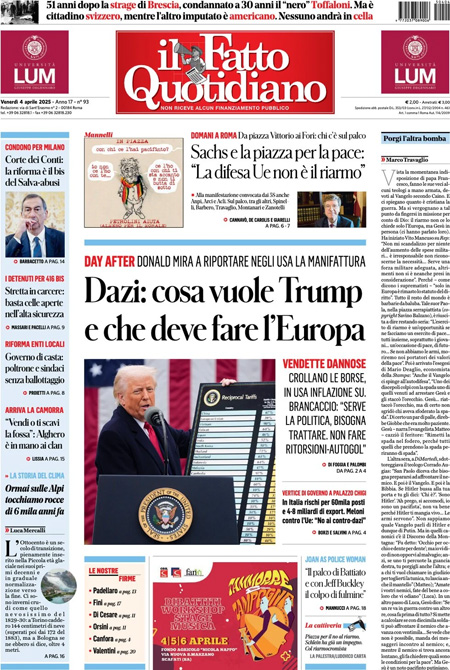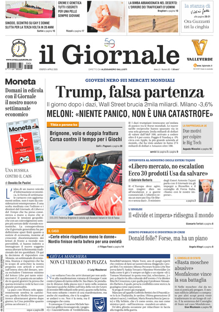 La principale notizia di oggi in apertura sui quotidiani è quella relativa alla pessima giornata delle Borse, soprattutto di quella statunitense, in seguito all’annuncio dei dazi da parte del presidente degli Stati Uniti Donald Trump. “Dazi, primo effetto: Borse a picco”, è la prima pagina del Corriere della Sera. “I dazi travolgono le Borse”, è l’apertura di Repubblica. “Sanno solo urlare: mamma li dazi”, titola La Verità.