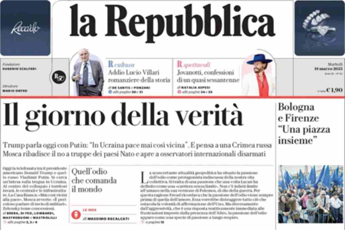 La principale notizia di oggi in apertura sui quotidiani è quella relativa alla telefonata in programma oggi fra il presidente degli Stati Uniti Trump e quello russo Putin, per cercare di trovare un’intesa per una tregua fra Russia e Ucraina. “Il giorno della verità”, titola Repubblica. “Tregua a Kiev, ore decisive”, è l’apertura del Corriere della Sera. “La piazzata pro-Ue pagata dagli italiani”, è invece la prima pagina di Libero.