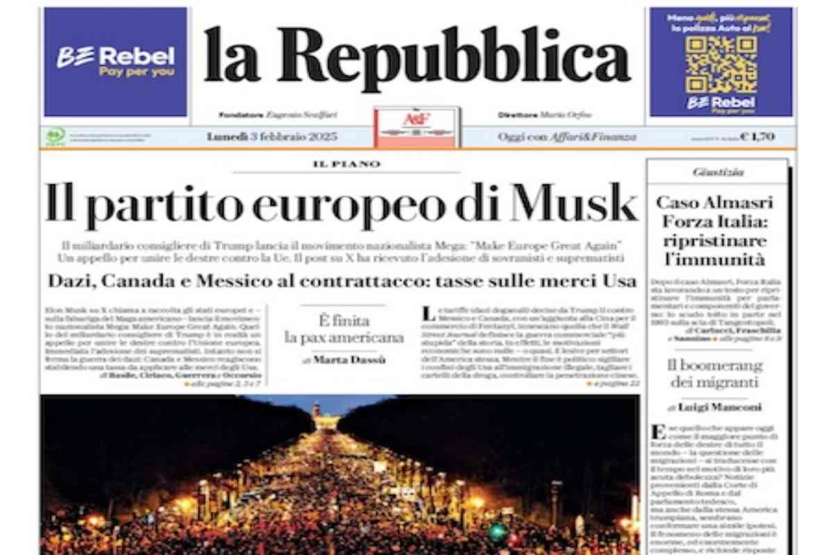 L'EDICOLA, Repubblica: "Il partito europeo di Musk". Il Corriere: "La Cina contrattacca sui dazi Usa". Libero: "La Mega strizza dell'Europa" - Blitz Quotidiano