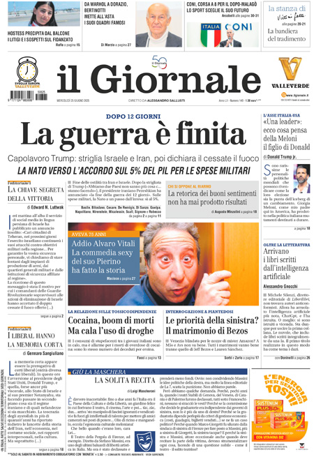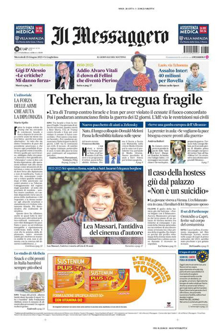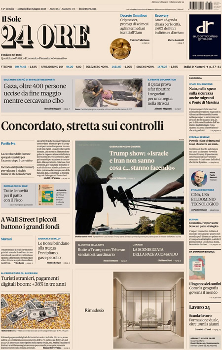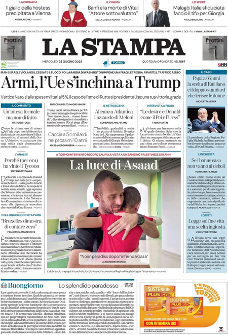 La notizia principale di oggi in apertura sui quotidiani è quella relativa al cessate il fuoco raggiunto fra Iran e Israele dopo dodici giorni di guerra, con la mediazione del presidente degli Stati Uniti Donald Trump che ieri mattina ha imposto l’accordo ai due Paesi. “Armi, l’Ue s’inchina a Trump”, titola La Stampa. “Israele-Iran, la tregua regge”, è l’apertura di Repubblica. “La guerra è già finita e l’ha persa Netanyahu. Per Ora”, è invece la prima pagina del Fatto Quotidiano.