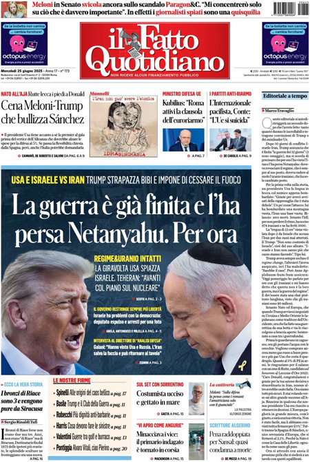 “Editoriale a tempo”. L’editoriale di Marco Travaglio: “Questo editoriale si autodistruggerà un secondo dopo che l’avrete letto: tanto quanto durano le incrollabili e tetragone convinzioni di Trump e dei minileader Ue. Dopo 10 giorni di conflitto Israele-Iran, Trump annuncia che è finita “la guerra dei 12 giorni” (2 sono omaggio), ma si scorda di precisare che per ora l’ha vinta l’Iran…”.