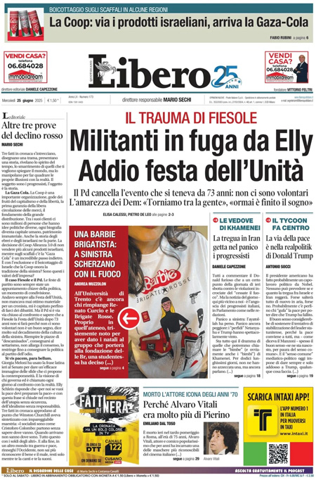 “Altre tre prove del declino rosso”. L’editoriale di Mario Sechi: “Tre fatti in cronaca s’intrecciano, disegnano una trama, presentano una storia, rivelano lo spirito del tempo, lo smarrimento di quelli che ti vogliono spiegare il mondo, ma lo manipolano per far quadrare le proprie illusioni con la realtà. Il soggetto sono i progressisti, l’oggetto è la storia. La Gaza Cola. La Coop è una importante organizzazione, gode dei frutti del capitalismo e della libertà, la prima garanzia della libera circolazione delle merci, il fondamento della grande distribuzione. Tra i suoi clienti ci sono milioni di persone che hanno idee politiche diverse, ogni biografia diventa capitale umano, patrimonio immateriale. Anche la storia degli ebrei e degli israeliani ne fa parte”.