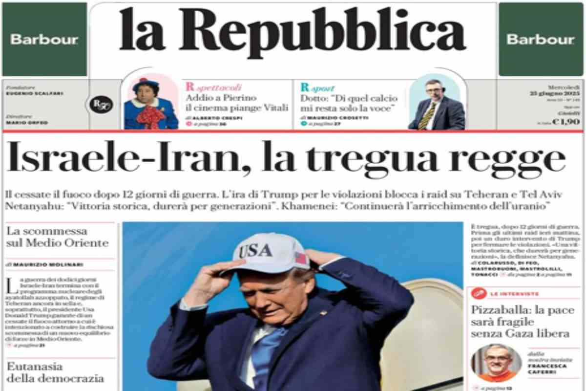 L'EDICOLA, Repubblica: "Israele-Iran, la tregua regge". La Stampa: "Armi, l'Ue s'inchina a Trump". Il Fatto: "La guerra è già finita e l'ha persa Netanyahu. Per Ora" - Blitz Quotidiano