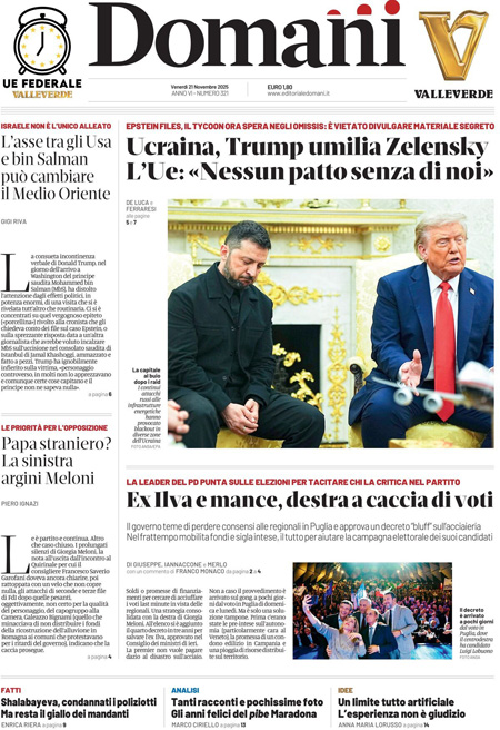 “Ucraina, Trump umilia Zelensky. L’Ue: ‘Nessun patto senza di noi'” (Domani).