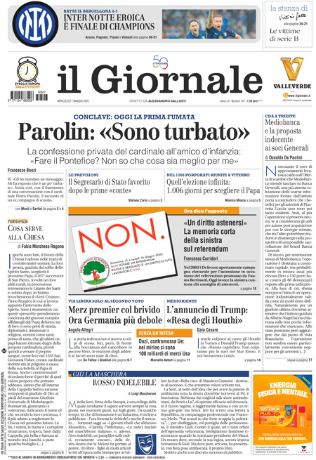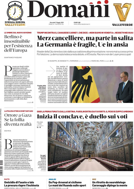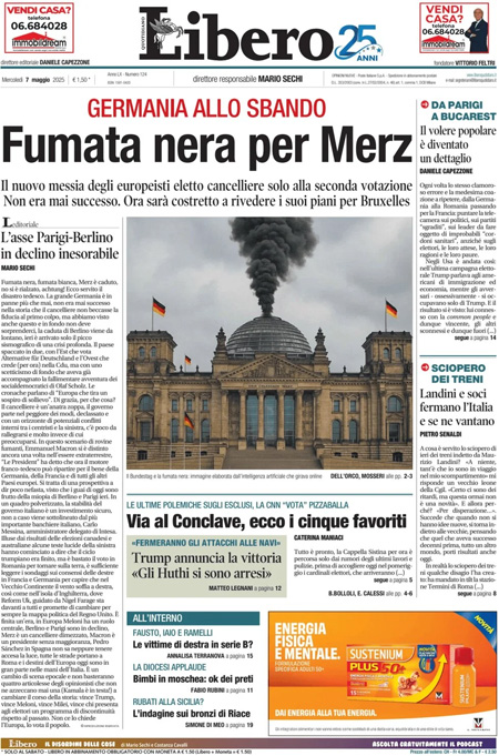 Sono due le notizie principali di oggi in apertura sui quotidiani: l’apertura del Conclave per l’elezione del nuovo Papa, in programma oggi pomeriggio con la prima votazione, e l’elezione a nuovo cancelliere tedesco del leader della CDU Friedrich Merz alla seconda votazione. “I giorni del Giudizio”, titola La Stampa. “La Chiesa sceglie il nuovo Papa”, è l’apertura di Repubblica. “Fumata nera per Merz”, è invece la prima pagina di Libero.