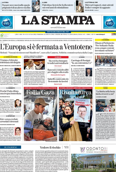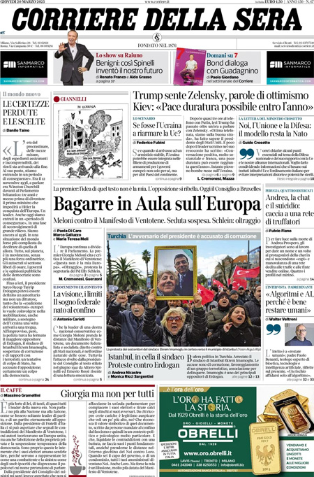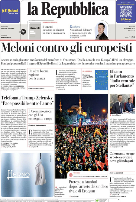 La principale notizia di oggi in apertura sui quotidiani è quella relativa alle comunicazioni della presidente del Consiglio Giorgia Meloni alla Camera in vista del Consiglio europeo, con le reazioni indignate dell’opposizione alle sue parole provocatorie sul Manifesto di Ventotene. “L’Europa si è fermata a Ventotene”, titola La Stampa. “Meloni contro gli europeisti”, è l’apertura di Repubblica. “La Lega disarma Meloni”, è invece la prima pagina del Fatto Quotidiano.