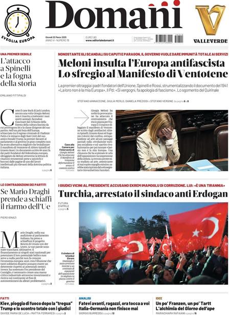 “Meloni insulta l’Europa antifascista. Lo sfregio al Manifesto di Ventotene” (Domani).