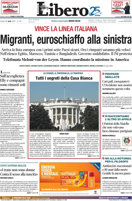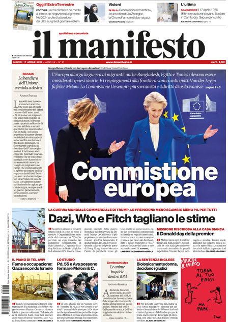 Sono diverse le notizie di oggi in apertura sui quotidiani: i dazi decisi dal presidente degli Stati Uniti Donald Trump e sul suo incontro di oggi con la presidente del Consiglio Meloni; la prima lista, proposta dalla Commissione Europea, di Paesi considerati “sicuri” per un esame più veloce delle richieste di asilo dei migranti provenienti da quei Paesi; le stime dell’agenzia di rating Fitch riguardo gli effetti dei dazi sul Pil globale. “Il piano Meloni-Von der Leyen”, titola La Stampa. “Pil mondiale a rischio”, è l’apertura di Repubblica. “Migranti, euroschiaffo alla sinistra”, è invece la prima pagina di Libero.