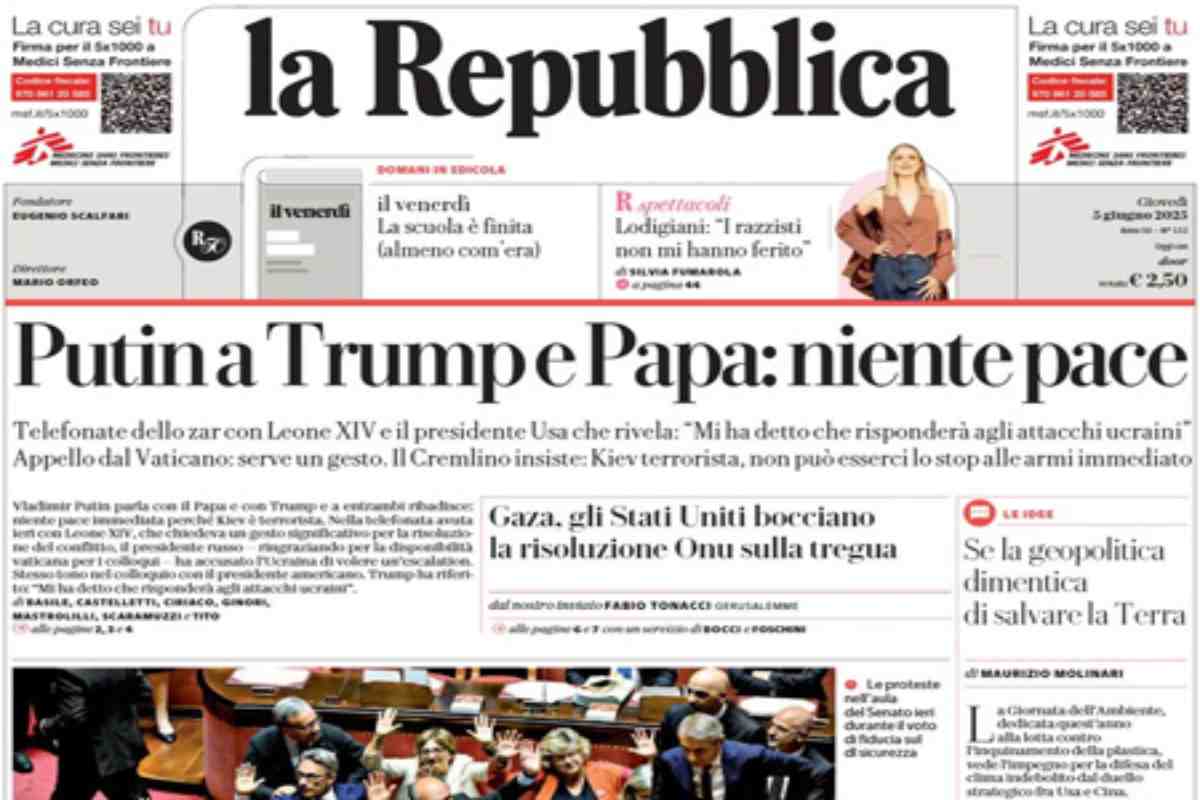 Sono due le notizie di oggi in apertura sui quotidiani: le telefonate del presidente russo Vladimir Putin con Papa Leone XIV e con il presidente degli Stati Uniti Donald Trump, al quale Putin ha annunciato nuovi attacchi all’Ucraina; l’approvazione in Senato del decreto “sicurezza”, fra le proteste dell’opposizione che ha manifestato in aula. “Casa, il governo blinda la proprietà privata”, titola Il Giornale. “Putin a Trump e Papa: niente pace”, è l’apertura di Repubblica. “L’asilo al Senato”, è invece la prima pagina di Libero.