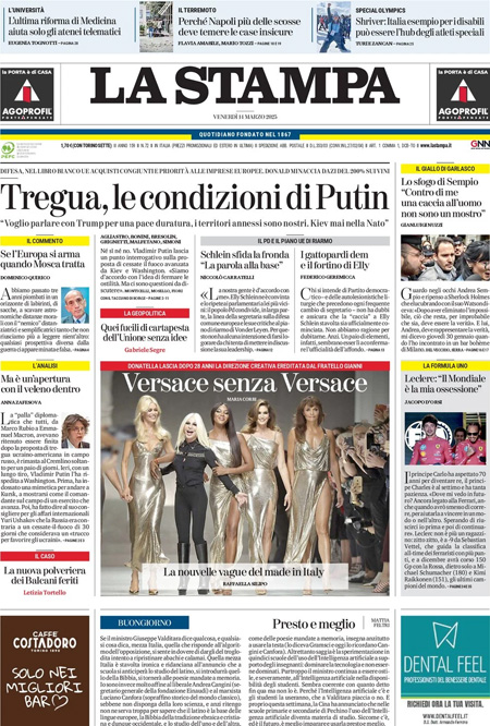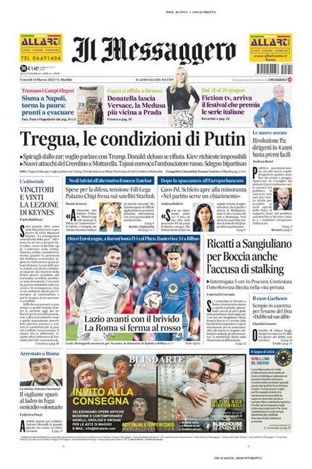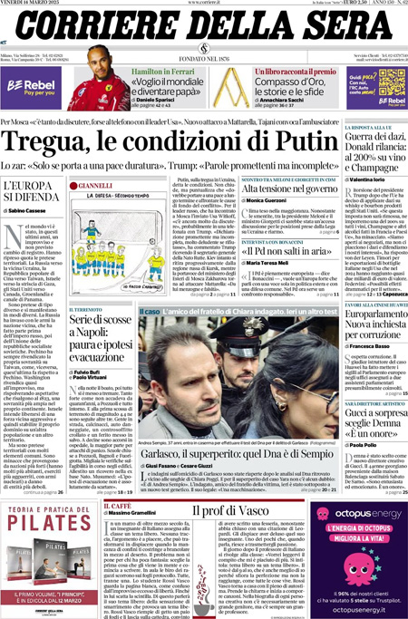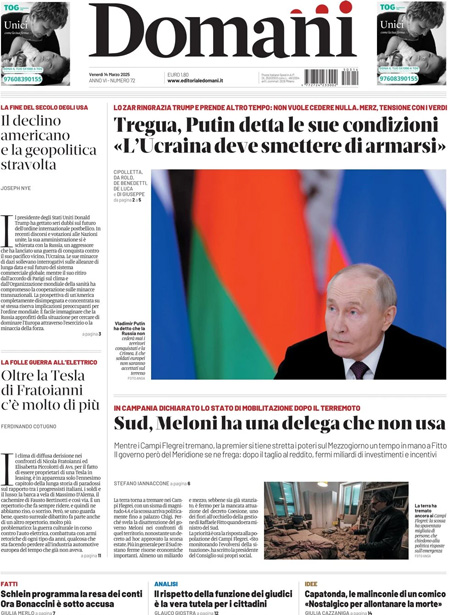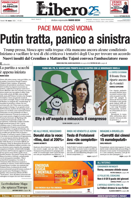 La principale notizia di oggi in apertura sui quotidiani è quella relativa alla risposta del presidente russo Vladimir Putin alla proposta statunitense di una tregua con l’Ucraina. Putin, il quale si è detto di sostenere la proposta, ha affermato però che ci sono ancora degli aspetti che vanno discussi con gli Stati Uniti prima di poterla accettare. “Tregua, le condizioni di Putin”, titola Il Corriere della Sera. “Tregua, Putin alza il prezzo”, è l’apertura di Repubblica. “Putin tratta, panico a sinistra”, è invece la prima pagina di Libero.