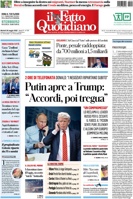 “Putin apre a Trump: Accordi, poi tregua” (Il Fatto Quotidiano).