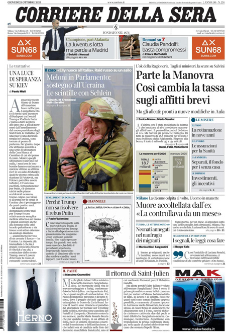 “Una luce di speranza su Kiev”, di Paolo Mieli: “Apparentemente siamo di fronte all’ennesimo buco nell’acqua. L’annullamento (o il rinvio) dell’incontro di Budapest tra Donald Trump e Vladimir Putin è parso a tutti la prova del fatto che, a più di nove mesi dall’insediamento del nuovo presidente degli Stati Uniti, le trattative per una pace o una duratura tregua in Ucraina, sono tornate al punto di partenza. Per giunta, dopo che abbiamo assistito a una serie di ultimatum della Casa Bianca al Cremlino di cui si è perso il conto. Mentre quegli ultimatum svanivano nel nulla, i russi con le loro bombe hanno continuato a mietere vittime su vittime (ieri in un asilo di Kharkiv, qualche giorno prima alla stazione di Pokrovsk, ma l’elenco potrebbe essere infinito)”.