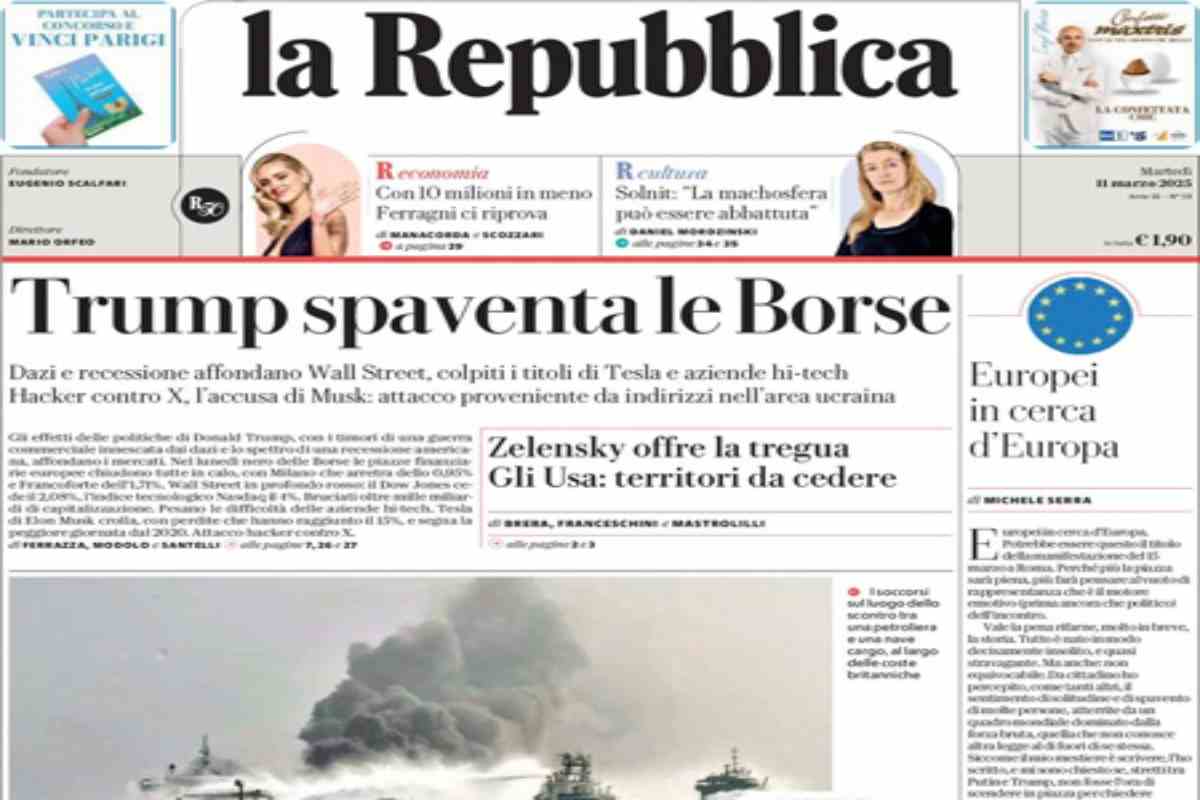 L'EDICOLA, Repubblica: "Trump spaventa le Borse". La Stampa: "Difesa, 200 miliardi dai privati". Il Fatto: "Eurobomb: Conte contro Ursula, Elly tra due fuochi" - Blitz Quotidiano