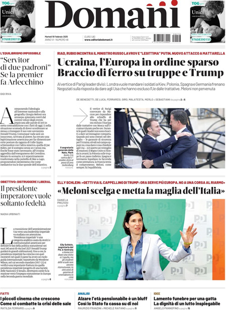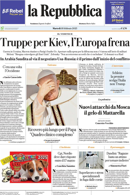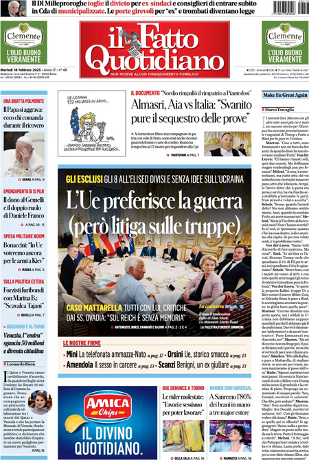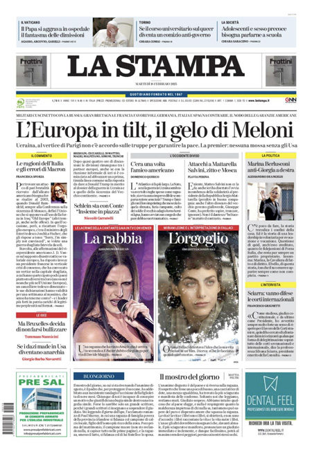 Home » L’EDICOLA, Repubblica: “Truppe per Kiev, l’Europa frena”. La Stampa: “L’Europa in tilt, il gelo di Meloni”. Il Fatto: “L’Ue preferisce la guerra (però litiga sulle truppe)”