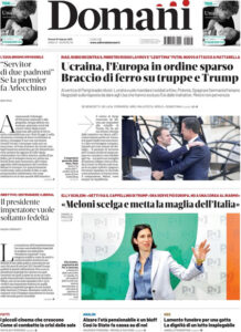 Oggi le aperture dei quotidiani sono dedicate all’incontro di ieri a Parigi con i leader dei Paesi europei per concordare, in risposta ai contatti fra Trump e Putin, un’iniziativa comune per arrivare a una tregua nella guerra tra Russia e Ucraina. Un incontro che pare non abbia portato a nulla di concreto. “L’Europa in tilt, il gelo di Meloni”, titola La Stampa. “Truppe per Kiev, l’Europa frena”, è l’apertura di Repubblica. “L’Ue preferisce la guerra (però litiga sulle truppe)”, titola invece il Fatto Quotidiano.