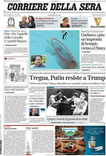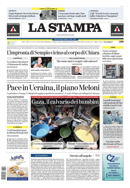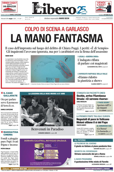 La principale notizia di oggi in apertura sui quotidiani è quella relativa al ritrovamento di un’impronta di Andrea Sempio, che segna l’ennesima svolta nelle indagini per l’omicidio di Chiara Poggi avvenuto nel 2007, a Garlasco. Alcuni giornali aprono invece con le iniziative diplomatiche per far finire la guerra fra Russia e Ucraina, con la telefonata fra la presidente del Consiglio Giorgia Meloni e Papa Leone XIV. “L’impronta di Sempio vicina al corpo di Chiara”, titola La Stampa. “Vertice sull’Ucraina. Meloni sente il Papa”, è l’apertura di Repubblica. “Trump molla Netanyahu e si sveglia persino la Ue”, è invece la prima pagina del Fatto Quotidiano.