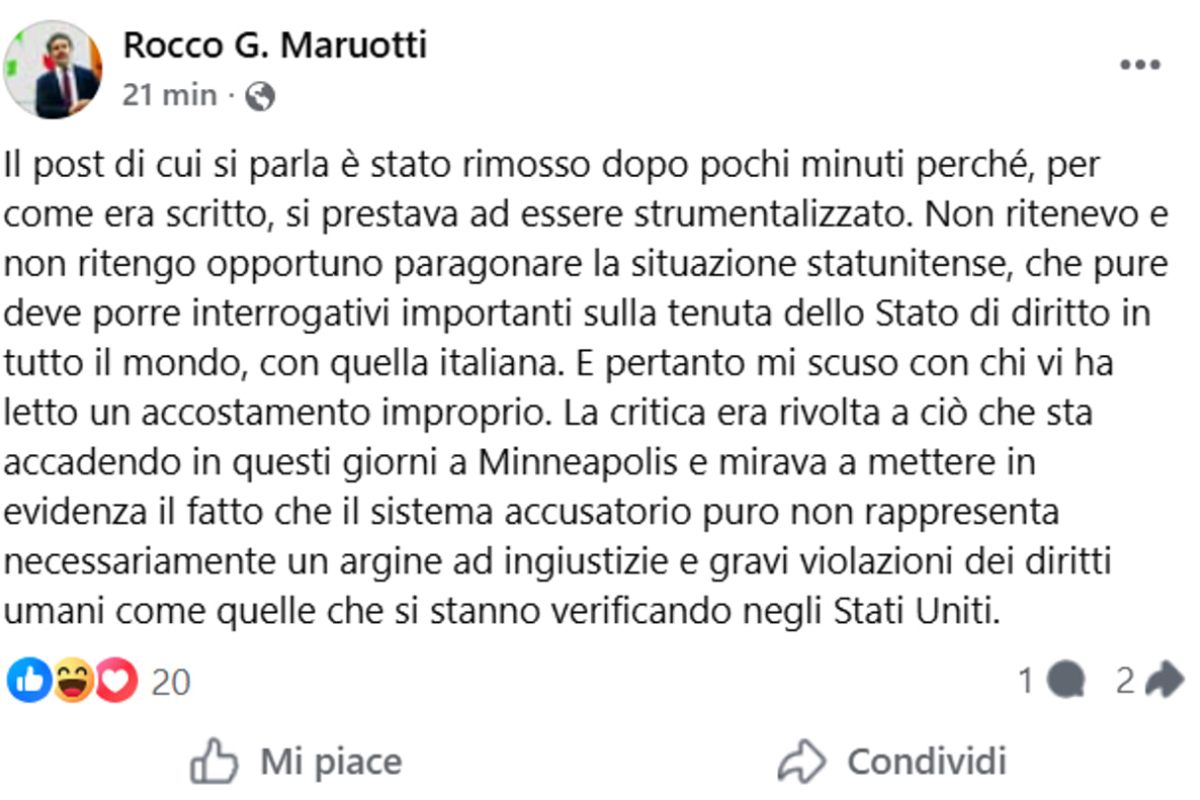 Di fronte alle reazioni, lo stesso Maruotti è tornato su Facebook per chiarire la propria posizione e ridimensionare il significato del messaggio. Il magistrato ha spiegato: “Il post di cui si parla è stato rimosso dopo pochi minuti perché, per come era scritto, si prestava ad essere strumentalizzato”. Ha poi aggiunto un passaggio centrale: “Non ritenevo e non ritengo opportuno paragonare la situazione statunitense, che pure deve porre interrogativi importanti sulla tenuta dello Stato di diritto in tutto il mondo, con quella italiana. E pertanto mi scuso con chi vi ha letto un accostamento improprio”.