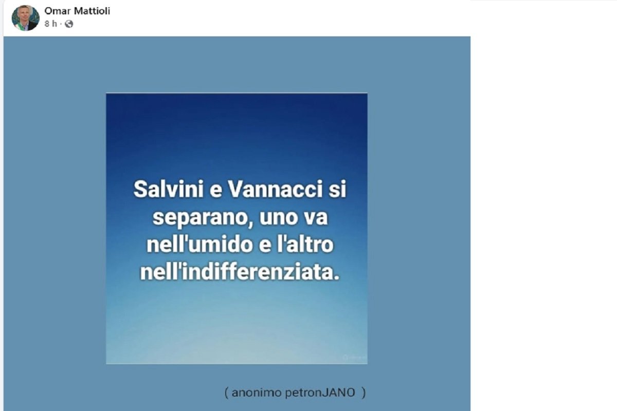 “Salvini e Vannacci si separano, uno va nell’umido e l’altro nell’indifferenziata”. Con questa frase, citazione di un altro account, su Facebook il sindaco di Baricella (Bologna) Omar Mattioli commenta la nuova esperienza politica del generale Vannacci, ormai ex Lega. Un post che ha sollevato polemiche da parte del Carroccio.