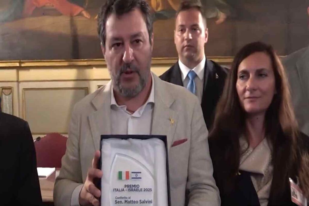 Una rete di associazioni vicine a Gerusalemme ha riconosciuto il vicepremier come “miglior amico di Israele in Italia” ed ha premiato le sue “posizioni coraggiose e spesso di rottura”, pro Israele “anche nei momenti più difficili”. Il leader leghista ha accettato “onorato” e un po’ imbarazzato per le lodi ed ha ammesso che è un premio “non comodo”.