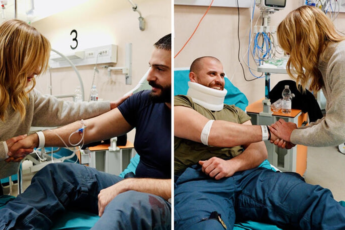 La presidente del Consiglio Giorgia Meloni stringe la mano ai due agenti feriti negli scontri di sabato, Lorenzo Virgulti (a destra) e Alessandro Calista (a sinistra), durante la visita all’ospedale Le Molinette. (Foto Ansa)