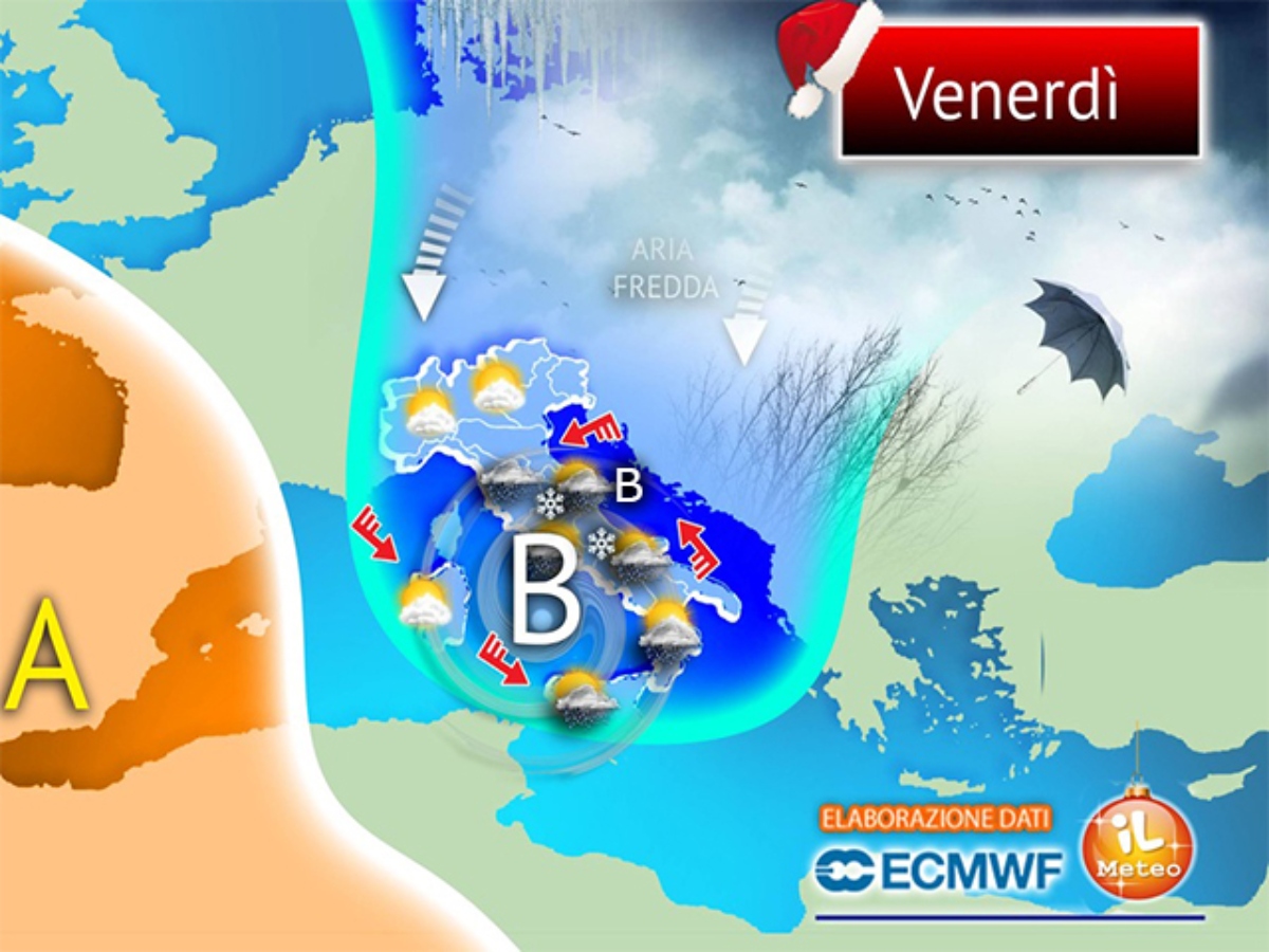 L’aria più fredda che affluirà da nord determinerà un brusco calo termico verso valori anche sotto le medie stagionali e il ritorno della neve su Alpi e Appennini. L’attuale tendenza, ancora piuttosto incerta, indica un miglioramento sabato a iniziare dal Centro-Nord, ma solo temporaneo con la possibilità che le forti correnti nord-occidentali in quota convoglino verso l’Italia un altro fronte freddo tra la fine di domenica e l’inizio della settimana di Natale.