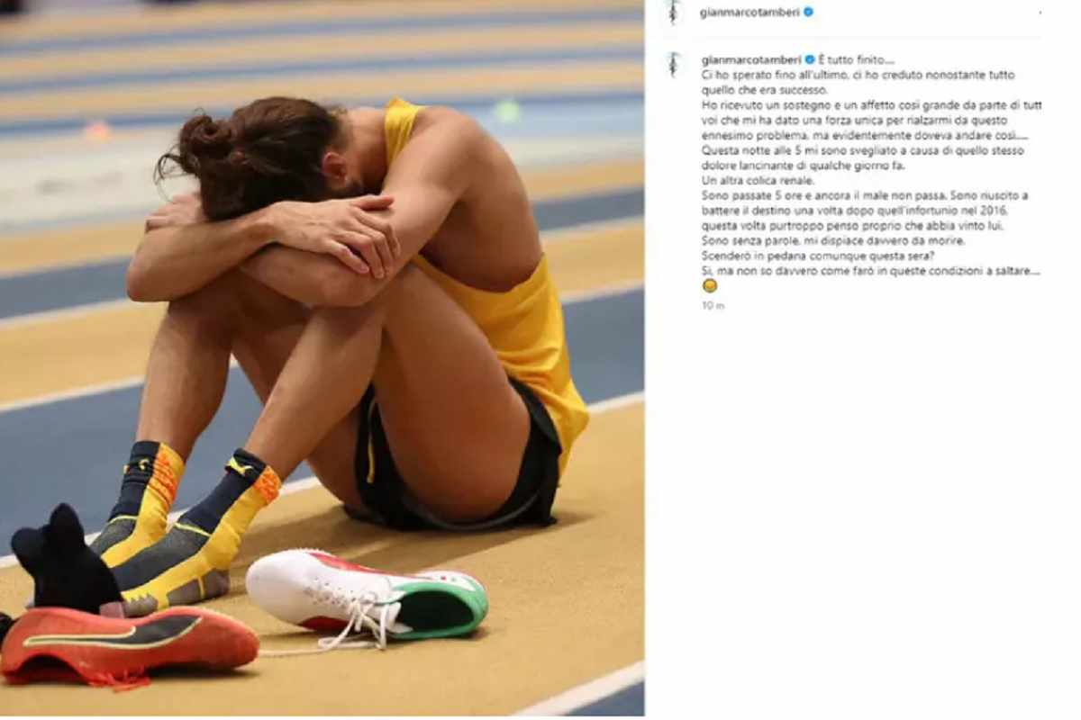 Nel post iniziale, Tamberi aveva scritto: “È tutto finito. Questa notte alle 5 mi sono svegliato a causa di quello stesso dolore lancinante di qualche giorno fa. Un’altra colica renale. Sono passate 5 ore e ancora il male non passa. Sono riuscito a battere il destino una volta dopo l’infortunio nel 2016, stavolta purtroppo penso proprio che abbia vinto lui. Scenderò in pedana comunque stasera? Si, ma non so davvero come farò in queste condizioni a saltare”.