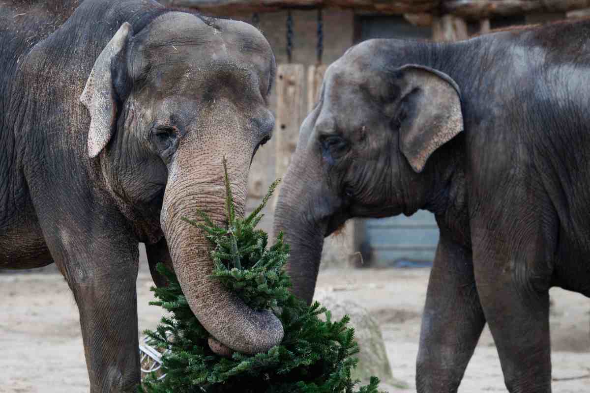 Allo zoo di Berlino sono stati dati in pasto agli elefanti gli alberi di Natale invenduti e ovviamente non trattati con agenti chimici o altro. Si tratta di una vera e propria tradizione che, nello zoo tedesco, si ripete ogni anno. In questa foto scattata oggi, venerdì 3 gennaio, ci sono due pachidermi che, all’interno del loro recinto, mangiano uno degli alberi che sono stati loro donati.