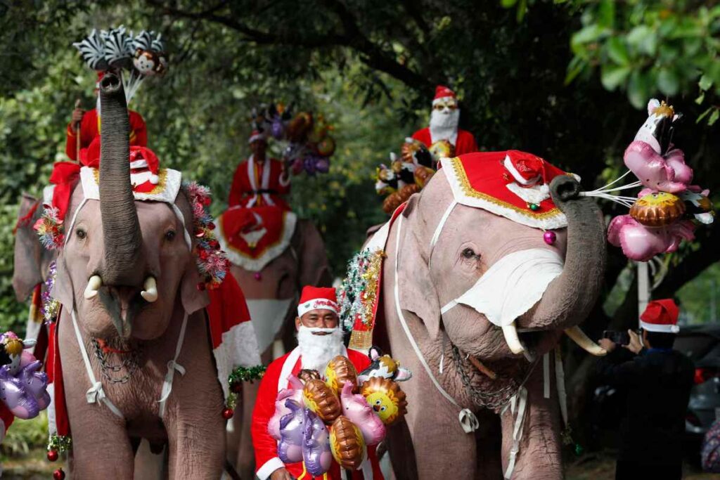 La foto del giorno, gli elefanti vestiti da Babbo Natale che portano regali ai bambini in Thailandia (foto ANSA) - Blitz quotidiano