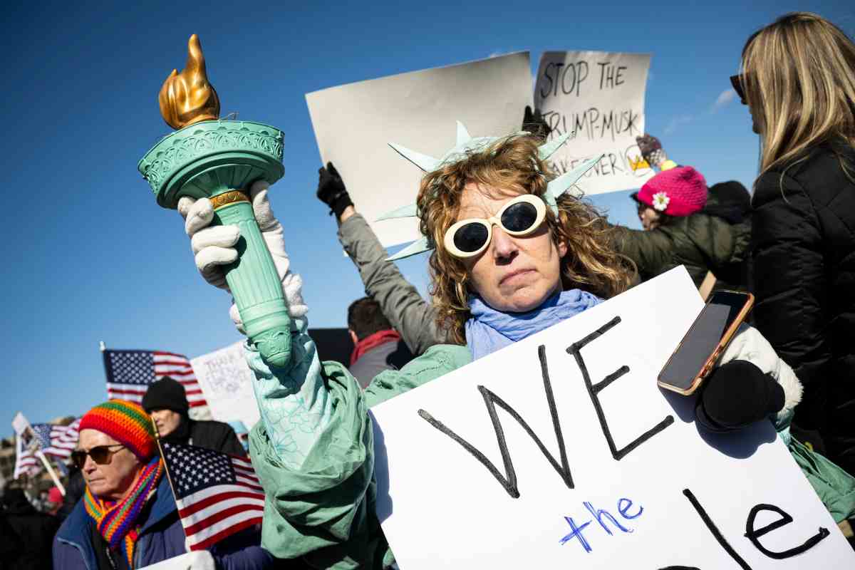 Una manifestante vestita da Statua della Libertà sfila a Washington, sul National Mall, vicino alla Casa Bianca. Il corteo è stato indetto per protestare contro gli ordini esecutivi firmati dal neo presidente degli Stati Uniti Donald Trump e si è svolto in occasione del Presidents’ Day.