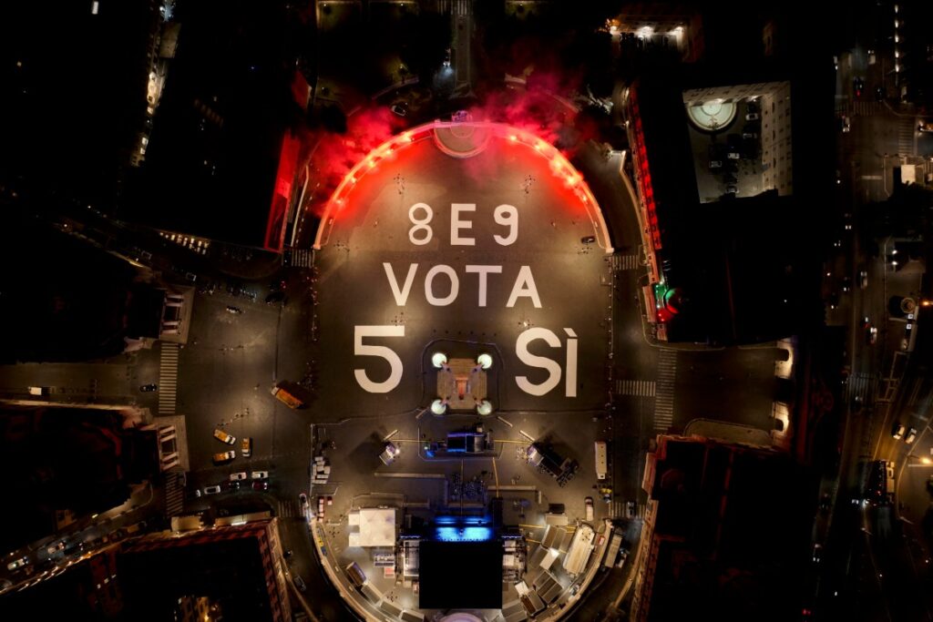 La scritta “Vota 5 sì” a caratteri cubitali in piazza del Popolo a Roma, realizzata dal comitato studentesco “Rete degli studenti Medi” con l’obiettivo di rilanciare la mobilitazione in vista dei referendum di domenica 8 e lunedì 9 giugno.