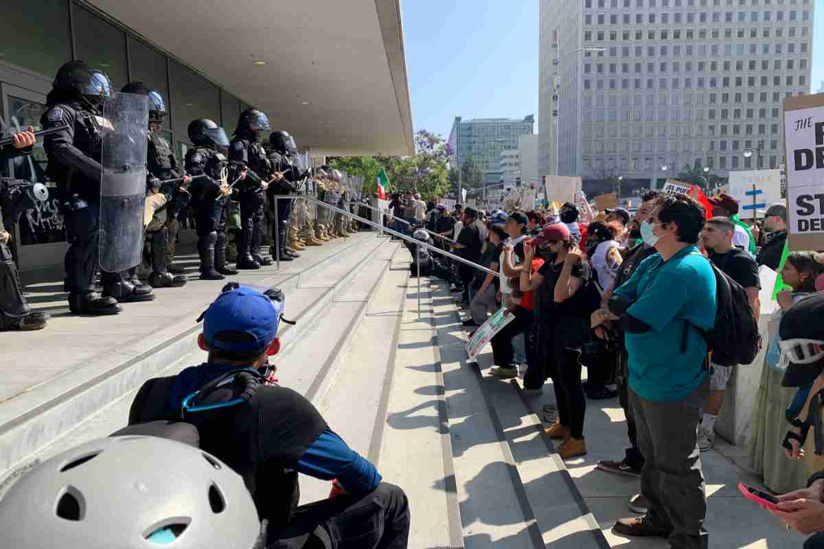 La tensione fra il governo federale e Los Angeles si è drammaticamente inasprita nel fine settimana dopo che i residenti sono scesi in strada per manifestare contro una serie di brutali repressioni nelle comunità di immigrati. E mentre a contestare i metodi adottati da Trump, che annuncia l’arrivo in città di 700 marines, è anche il governatore della California e il sindaco di Los Angeles, in città si è svolta una grande manifestazione pro migranti davanti all’edificio federale di Down Town, quello che rilascia la green card che permette di vivere e lavorare negli Stati Uniti.