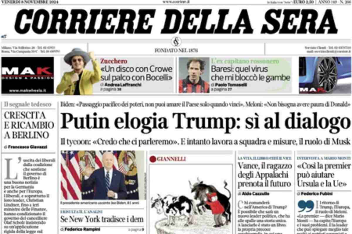 L’attenzione di tutti i principali giornali oggi si concentra sulla recente vittoria di Donald Trump alle elezioni presidenziali degli Stati Uniti. I titoli esplorano le possibili iniziative che Trump potrebbe intraprendere nei suoi primi mesi di mandato, suscitando interesse e curiosità su come la sua presidenza potrebbe influenzare la politica globale. “Putin elogia Trump”, titola per esempio il Corriere della Sera. Più di parte, come è ovvio che sia, Libero con un bel “La pax trumpiana” in prima pagina.