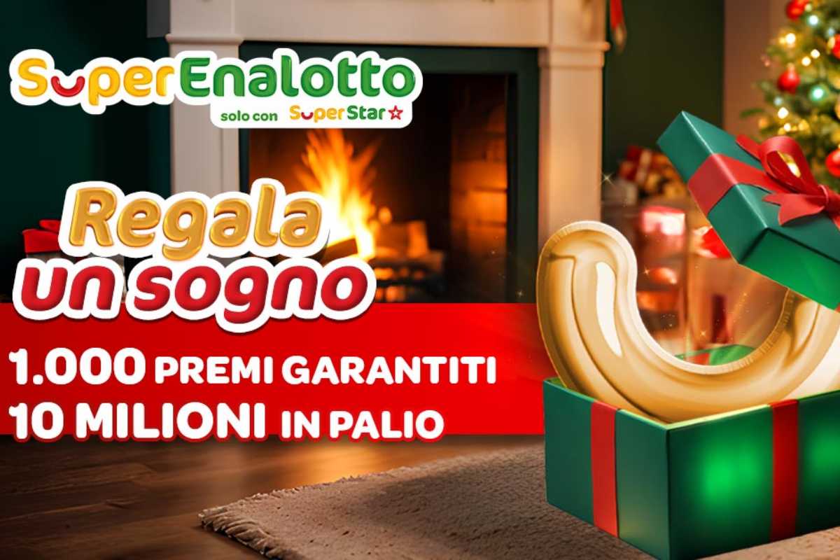 Con SuperEnalotto SuperStar è in arrivo un’iniziativa speciale dedicata agli amanti del Natale e delle festività. Si tratta dell’iniziativa speciale “Regala un sogno”, con cui la lotteria più famosa d’Italia mette in palio un montepremi complessivo di 10 milioni di euro, suddiviso in 1.000 premi garantiti da 10.000€ ciascuno.