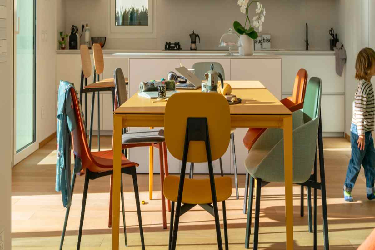 Per chi ama osare, il contrasto tra un tavolo in legno scuro e sedie in plastica gialle o verdi può dare vita a un’atmosfera fresca e stimolante. Un mix che invita alla convivialità.