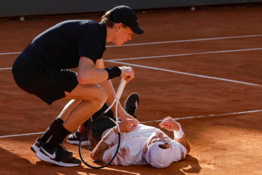 Solito copione iniziale. Parte bene De Jong, va in vantaggio, poi subisce le risposte di Sinner. Sul 3-1 per Sinner l’olandese scivola, cade di brutto, lo soccorre il fisioterapia, riprende e accorcia: 3-2.