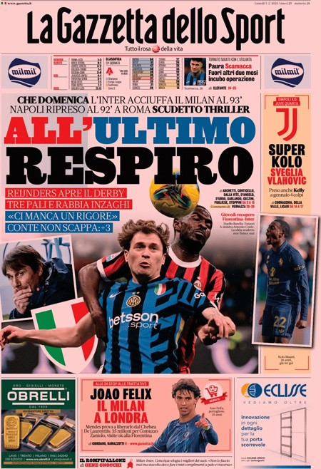 Sulle prime pagine sportive di oggi, lunedì 3 febbraio 2025, risalto all’ultima giornata, la ventitreesima, di Serie A. Napoli e Inter non vanno oltre il pareggio a Roma e nel derby col Milan. Fermata anche l’Atalanta dal Torino, bene la Juve che vince contro l’Empoli. La Gazzetta dello Sport scrive: “Scudetto thriller. L’Inter acciuffa il Milan al 93′, Napoli ripreso al 92′ a Roma”.