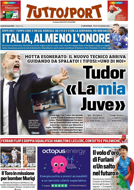 Sulle prime pagine dei quotidiani sportivi di oggi, lunedì 24 marzo, in grande risalto l’esonero di Thiago Motta dalla Juventus, con l’arrivo di Igor Tudor, e il pareggio dell’Italia contro la Germania che vuol dire eliminazione dalla Nations League. Spazio anche alla Formula Uno con il disastro Ferrari nel Gp di Cina (entrambe le Rosse squalificate) e l’oro nel lungo ai Mondiali indoor di Mattia Furlani.