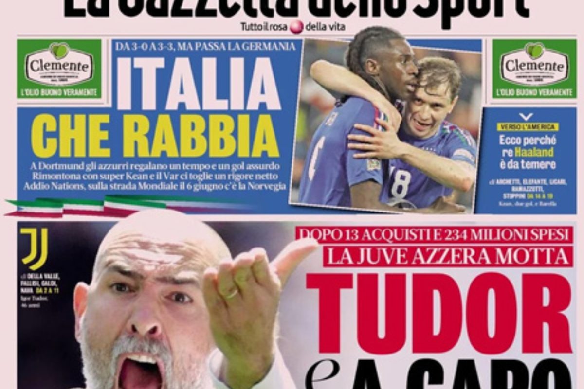 Sulle prime pagine dei quotidiani sportivi di oggi, lunedì 24 marzo, in grande risalto l’esonero di Thiago Motta dalla Juventus, con l’arrivo di Igor Tudor, e il pareggio dell’Italia contro la Germania che vuol dire eliminazione dalla Nations League. Spazio anche alla Formula Uno con il disastro Ferrari nel Gp di Cina (entrambe le Rosse squalificate) e l’oro nel lungo ai Mondiali indoor di Mattia Furlani.