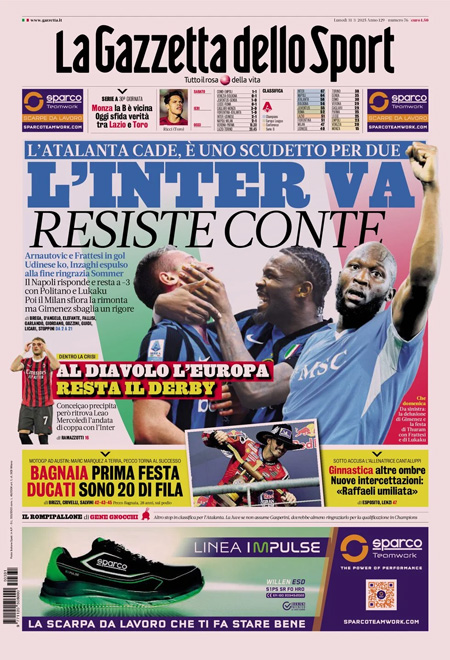 “L’Inter va, resiste Conte. L’Atalanta cade, è uno scudetto per due”. (La Gazzetta dello Sport)