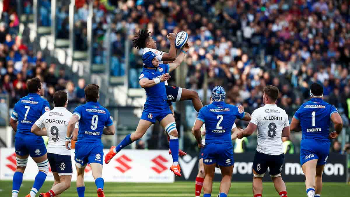Stadio gremito, sole, temperatura sui 16 gradi, fanfara dei Bersaglieri. Calcio di inizio alle 16.03. Avvio rabbioso dei francesi contenuti con placcaggi perfetti. Ma dopo dieci minuti i galletti vanno a meta (annullata). Un minuto dopo è l’Italia che va in meta con Menoncello. E’ 7-0. Immediata la reazione furibonda della Francia, meta viziata da un in avanti (7-7). Replica azzurra al 18’ con Brex,Allan tra i pali (10-7). Sorpasso francese con una meta, trasformata da Ramos e poi Sua Maestà Dupont firma a terza meta, trasformata (10-21).
