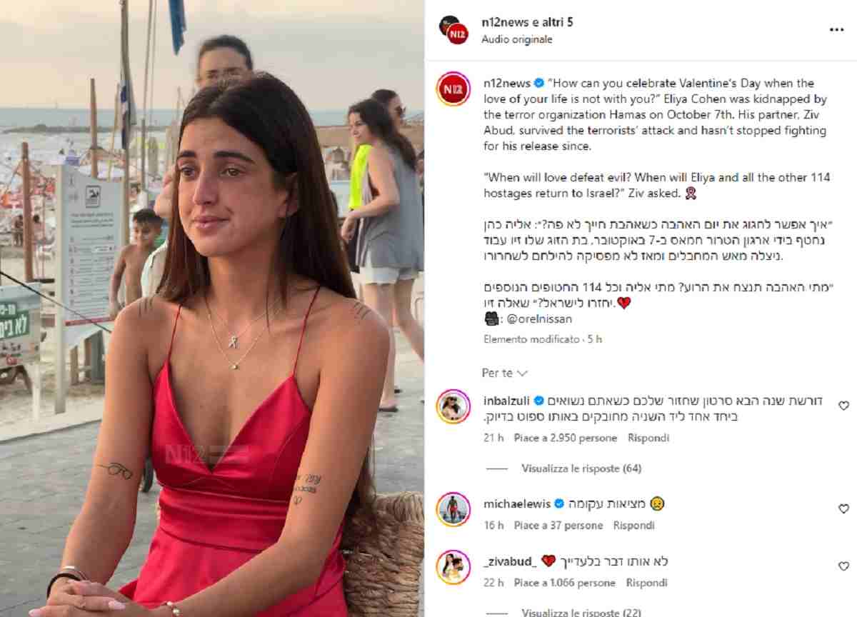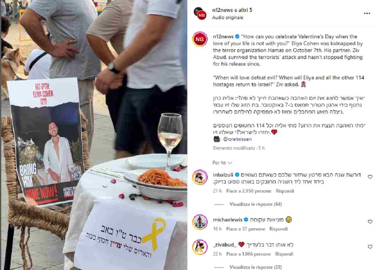 Brinda alla festa dell'amore davanti alla foto del suo ragazzo rapito da Hamas (foto Instagram) - Blitz Quotidiano