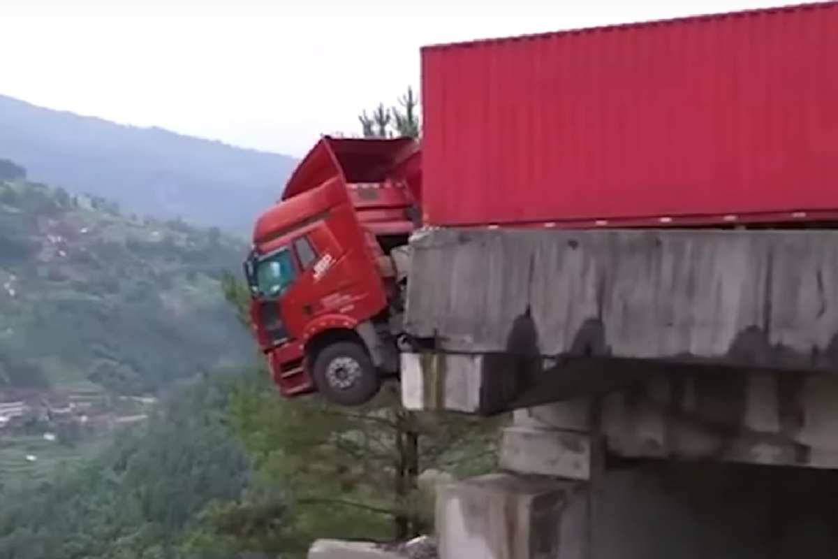 Nella provincia di Guizhou, nel sud-ovest della Cina, un camion è rimasto sospeso nel vuoto sul ciglio di un ponte crollato. Un tratto della Xiamen-Chengdu Expressway, infatti, è collassato a causa di una frana provocata dalle intense piogge monsoniche. Uno dei pilastri principali, indebolito dal terreno saturo d’acqua, ha ceduto provocando il parziale crollo della carreggiata. Il conducente all’interno della cabina si è così visto crollare il cemento proprio sotto ai suoi occhi, rimanendo sospeso, intrappolato e senza alcuna via di fuga.