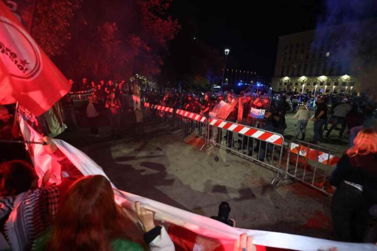 Durante il presidio, il cui video è stato riportato anche da alanews, sono stati lanciati anche alcuni fumogeni. Non sono mancati poi i cori e i fischi contro il ministro degli Esteri Antonio Tajani e la presidente del Consiglio Giorgia Meloni.
