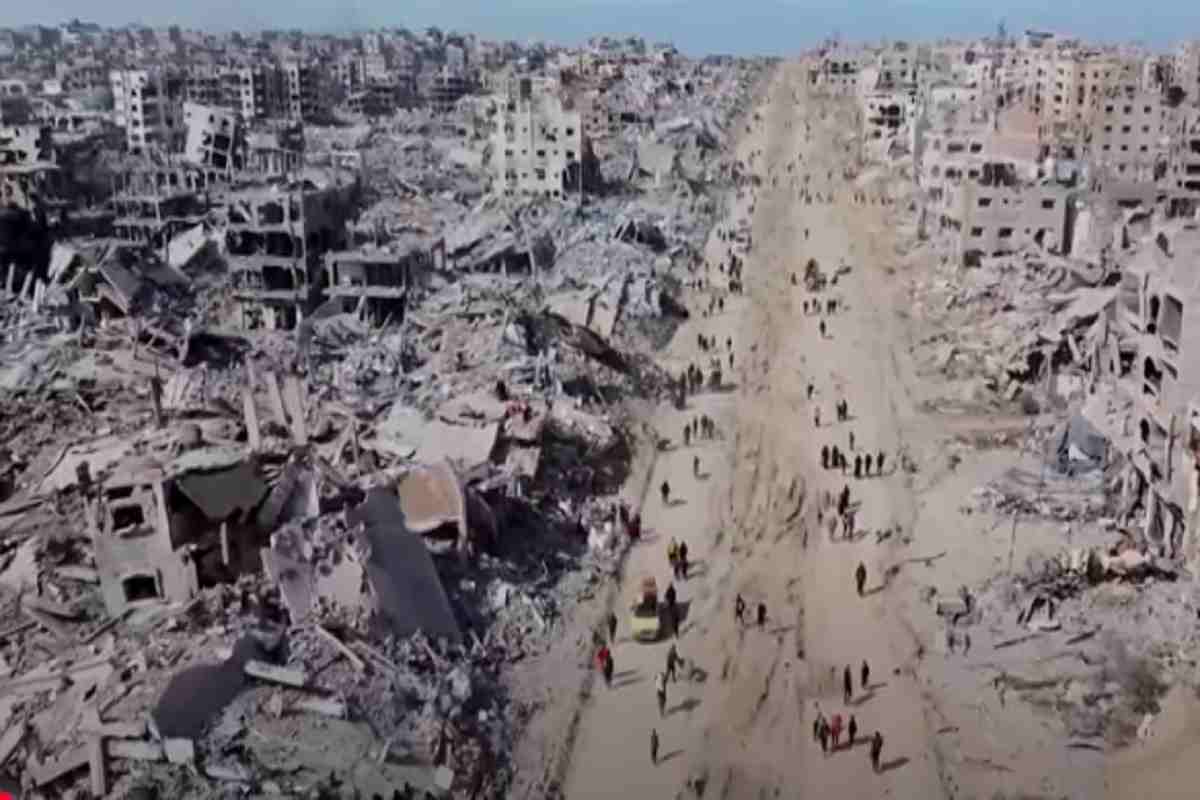 Il dramma che stanno vivendo gli sfollati palestinesi che, a Gaza, stanno tornando nelle loro case dopo la sottilissima tregua raggiunta, è documentato da un video girato da un drone a Jabalia nel nord della Striscia. Qui si vedono centinaia di persone che camminano tra gli edifici rasi al suolo su un terreno dove non è rimasto nulla, nemmeno l’asfalto.