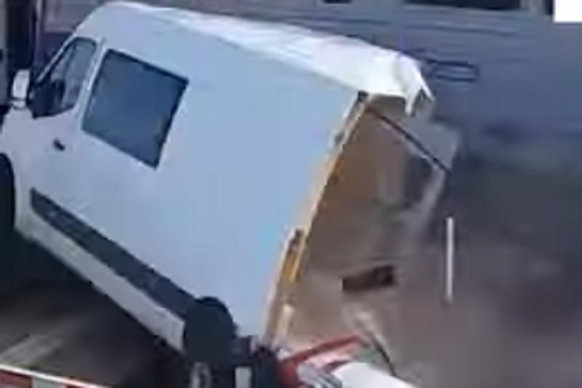 Un furgone prova a passare un passaggio a livello e resta intrappolato tra la ferrovia e le sbarre. L’autista prova a mettere in sicurezza il mezzo mettendolo di traverso fuori dal percorso del treno in arrivo ma non ci riesce e il furgone viene completamente travolto dal treno in transito.