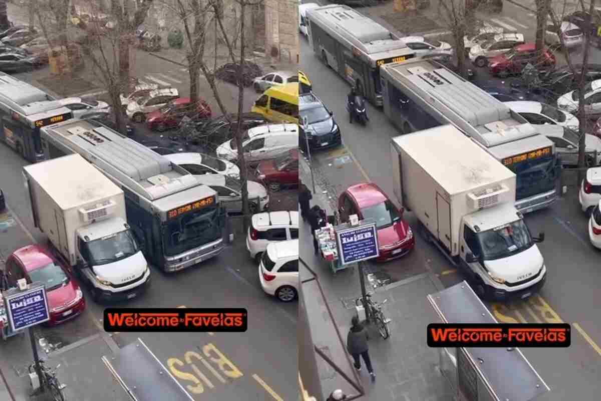 Il video del furgone in doppia fila che paralizza il traffico e rompe lo specchietto al bus (blitzquotidiano.it)